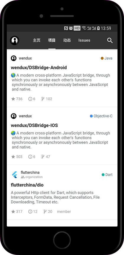 Github账号登录后,您可以在主页看到您的项目、动态、以及Issue列表。项目的star、fork、语言等信息一目了然。