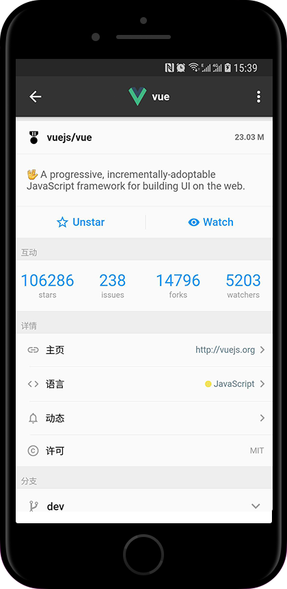 项目主页包含了项目简介、互动、分支、源码、文档、等各种信息。
